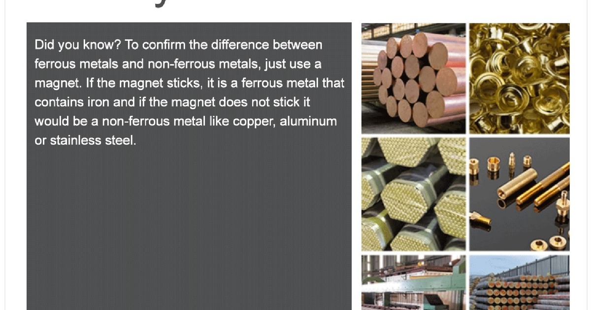 Did you know? To confirm the difference between ferrous metals and non-ferrous metals, just use a magnet. If the magnet sticks, it is a ferrous metal that contains iron and if the magnet does not stick it would be a non-ferrous metal like copper, aluminum or stainless steel.