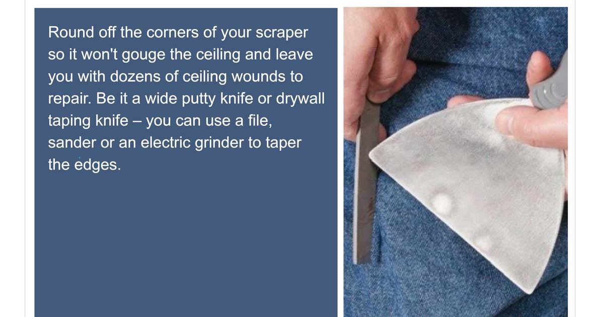 Round off the corners of your scraper so it won't gouge the ceiling and leave you with dozens of ceiling wounds to repair. Be it a wide putty knife or drywall taping knife - you can use a file, sander, or an electric grinder to taper the edges.