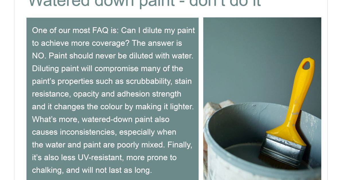 One of our most FAQs is: Can I dilute my paint to achieve more coverage? The answer is NO.