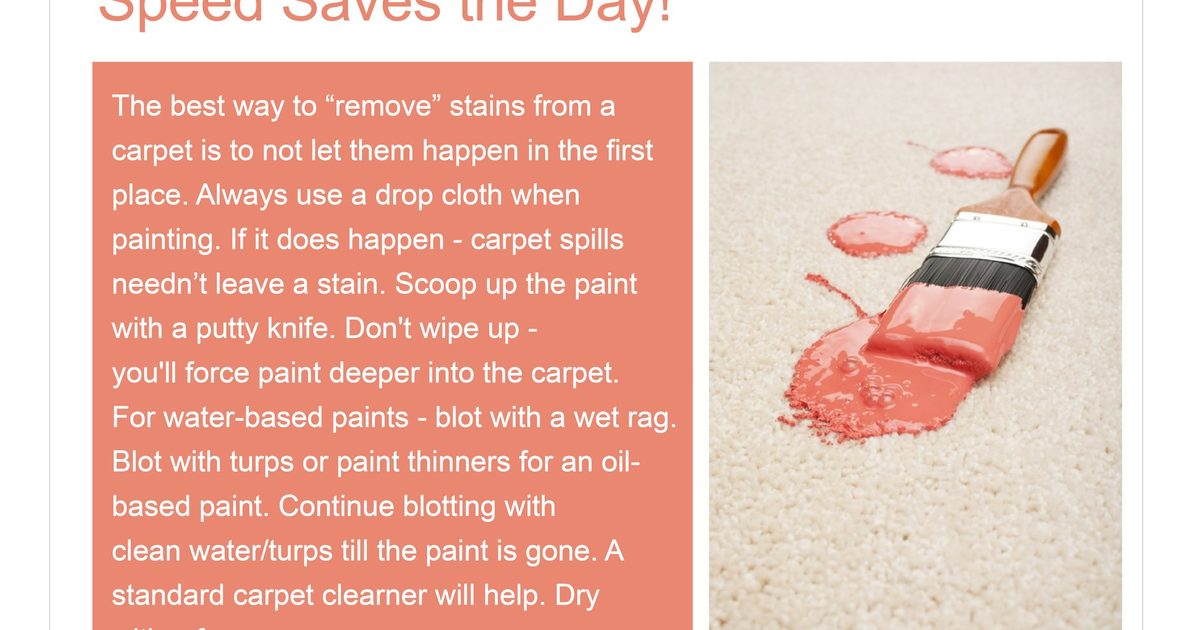 The best way to 'remove' stains from a carpet is to not let them happen in the first place. Always use a drop cloth when painting. If it does happen - carpet spills needn't leave a stain. Scoop up the paint with a putty knife. Don't wipe up - you'll force paint deeper into the carpet. For water-based paints - blot with a wet rag. Blot with turps or paint thinner for an oil-based paint. Continue blotting with clean water/turps till the paint is gone. A standard carpet cleaner will help. Dry with a fan.