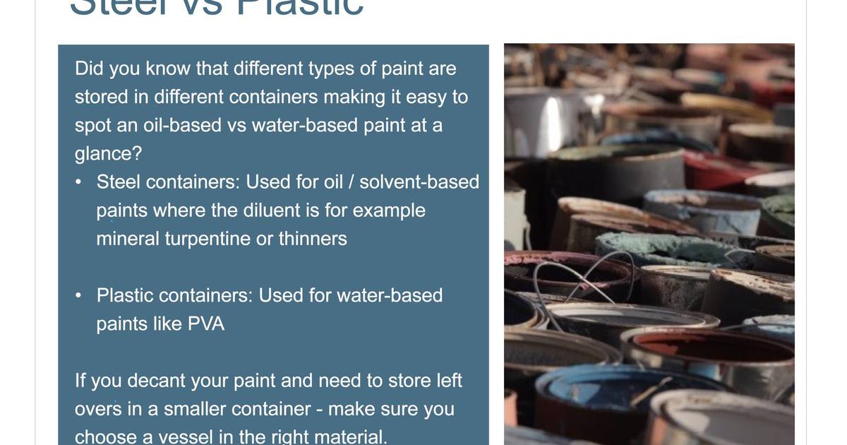 Did you know that different types of paint are stored in different containers making it easy to spot an oil-based vs water-based paint at a glance?