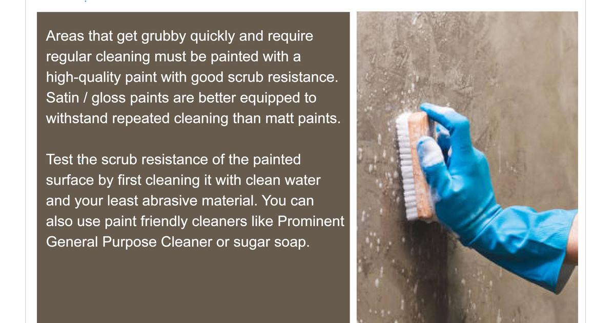 Test the scrub resistance of the painted surface by first cleaning it with clean water and your least abrasive material. You can also use paint-friendly cleaners like Prominent General Purpose Cleaner or sugar soap.