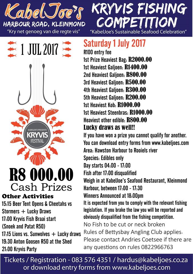 The third annual Kryvis Festival will once again be hosted by KabelJoe's Seafood Restaurant in the quaint and vibrant Harbour Road, Kleinmond. We will be kicking of the winter school holidays with a colourful and exciting celebration of seafood and the coastal lifestyle.