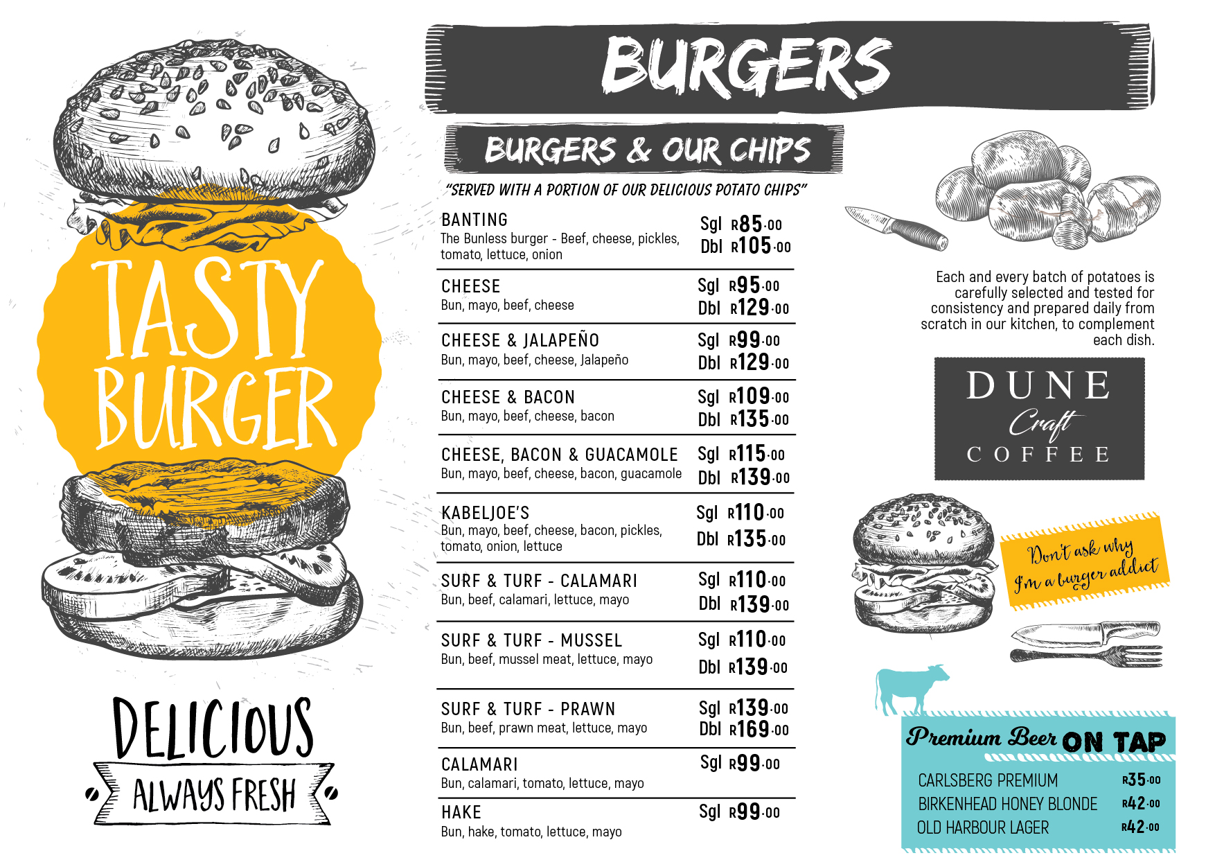 We thought long and hard and decided to create something on our menu for the non seafood eaters that accompany the real seafood lovers (Although we have 5 different seafood Burgers as well). So, here it is(after popular demand) a selection of 11 Different Burgers, Single or Double (It is BIG). We have carefully selected the ingredients of these burgers and have tried and tested every single one more than twice and we still test the quality daily to ensure that we give you the most consistent, juicy and flavourful Burgers. The Beef Patties are made in house by us. The chips are made from hand-cut fresh potatoes that we prepare daily. Come taste our champion Burgers!!