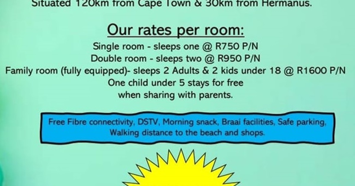 • Family Room (fully equipped): Sleeps 2 adults and 2 kids under 18 at R1,600 per night