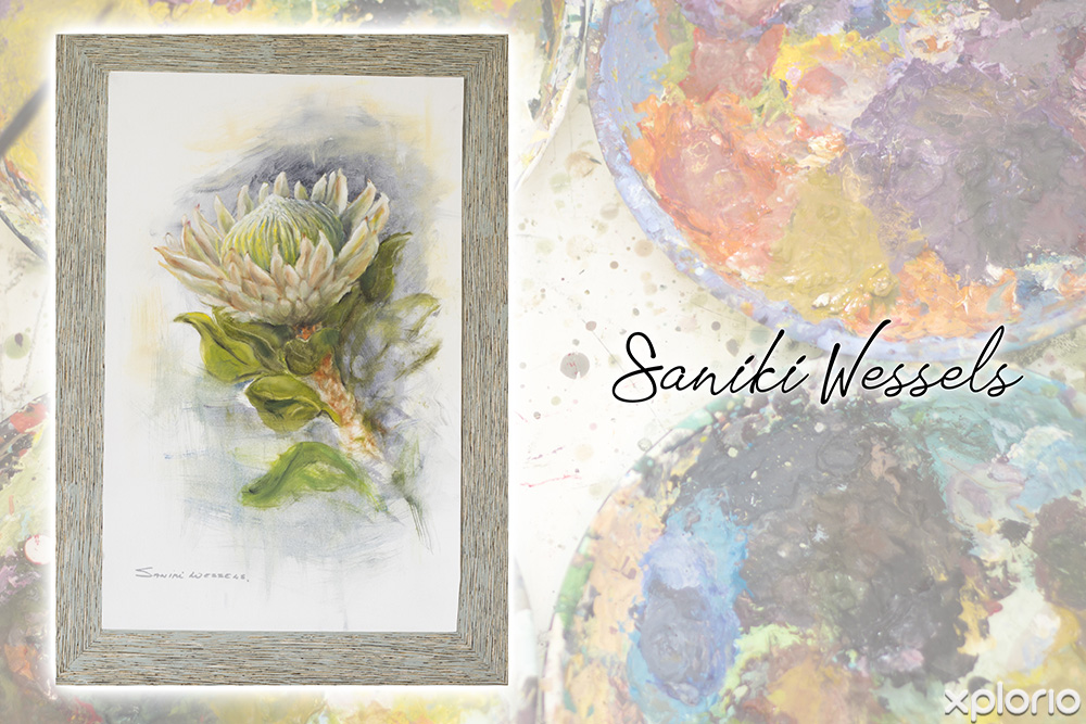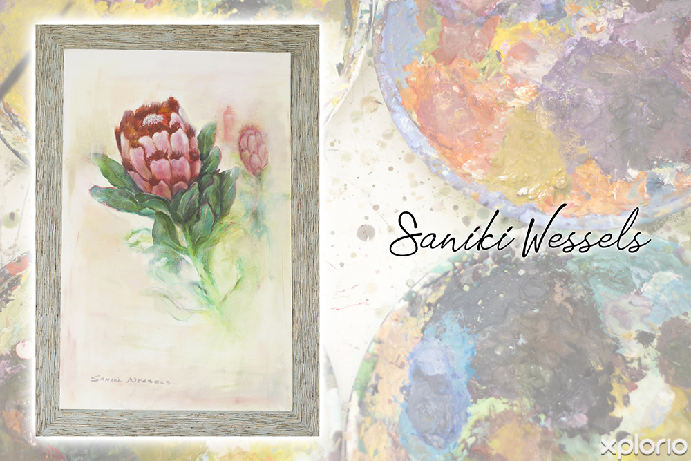 Every painting that Saniki Wessels paints is unique and she is currently showcasing Fynbos landscapes and the indigenous plants of the Overberg in her artworks. Saniki is a grandmother of four budding little artists who love to paint with her in her home studio.