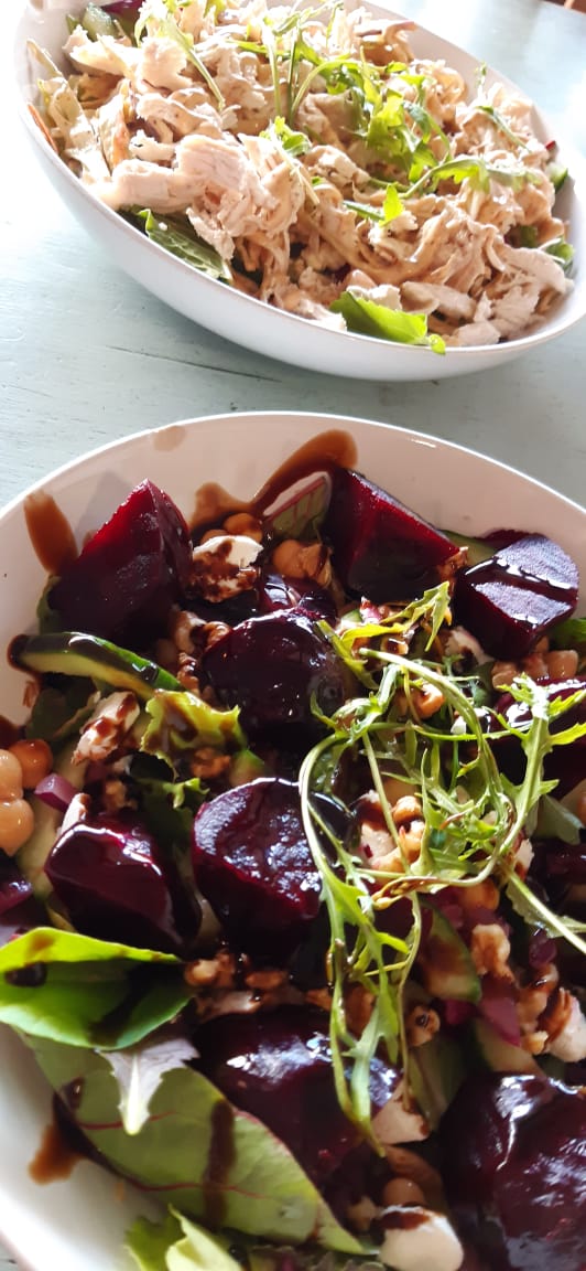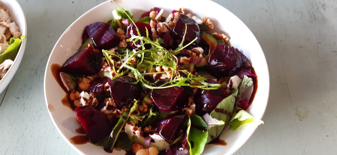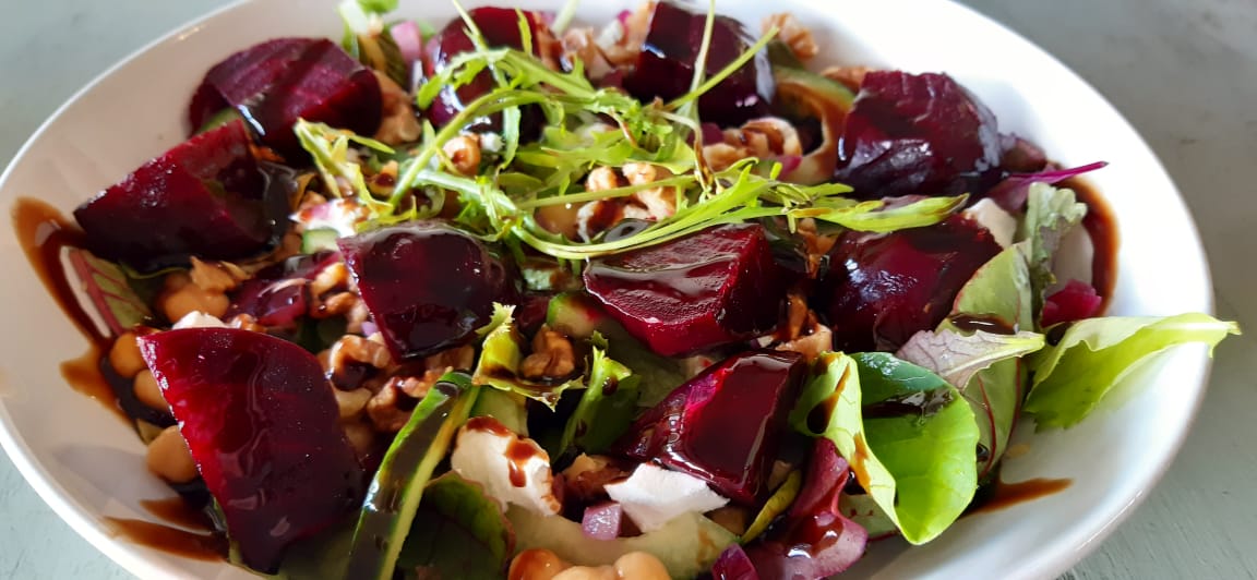 1. Beetroot salad with chickpeas, goat cheese, walnuts and a balsamic glaze.
