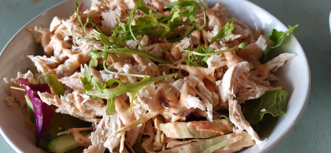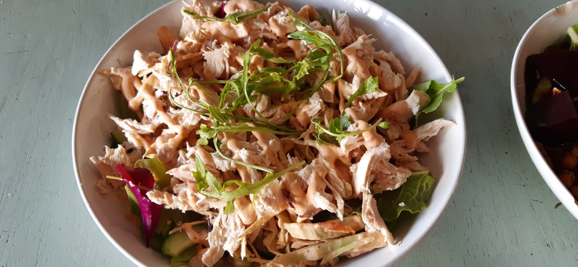 2. Chicken salad with harissa mayo coleslaw, feta and cocktail tomatoes.