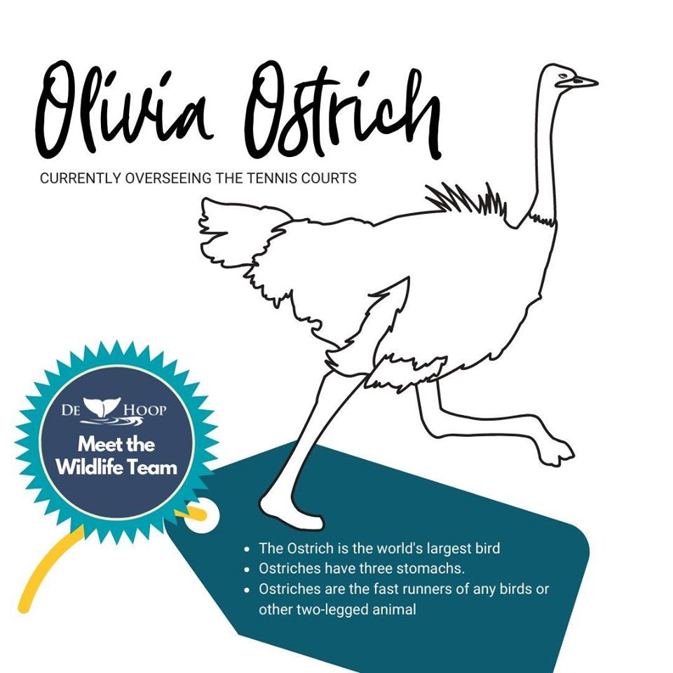 Today we introduce Olivia Ostrich, currently overseeing the tennis courts and play area. When you visit you will find her paying close attention to your stray tennis balls, you had better be quicker than she is in reaching them.