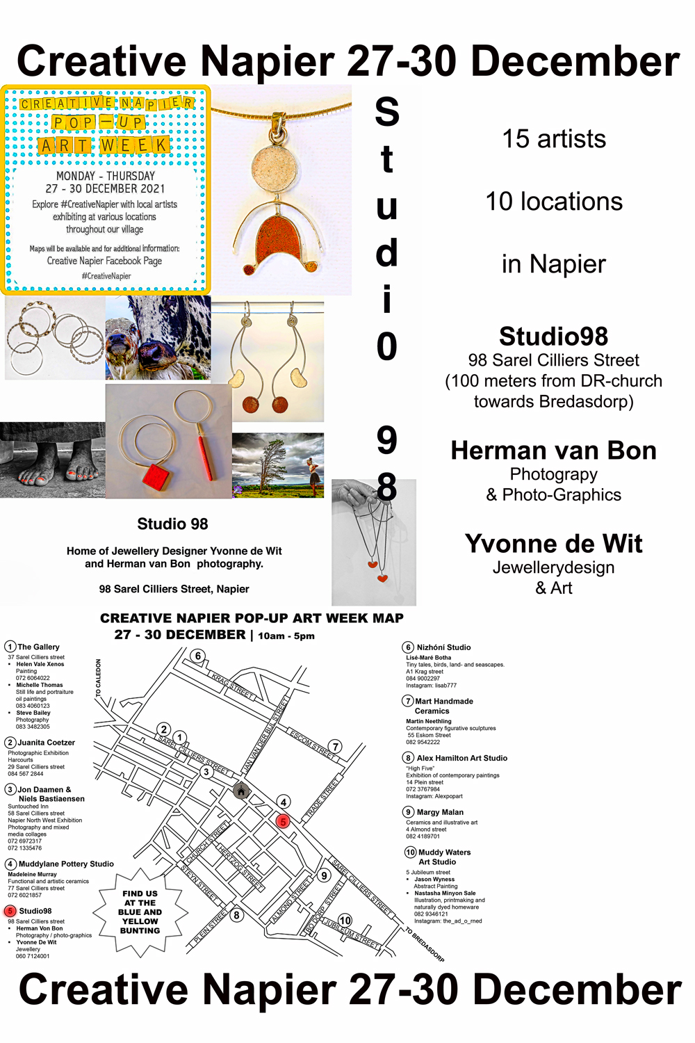In 2021 we started with workshops and lunch concerts for a maximum of 20 people. Last month we added guest artist (Marina Blight from Bredasdorp) and we also invited retired goldsmith Christine Farrington (UK) to introduce the jewellery designs of Yvonne for a selected public. We also participate in ‘Creative Napier’; a periodically returning art event where 15 local artists present their work in different locations in the village.