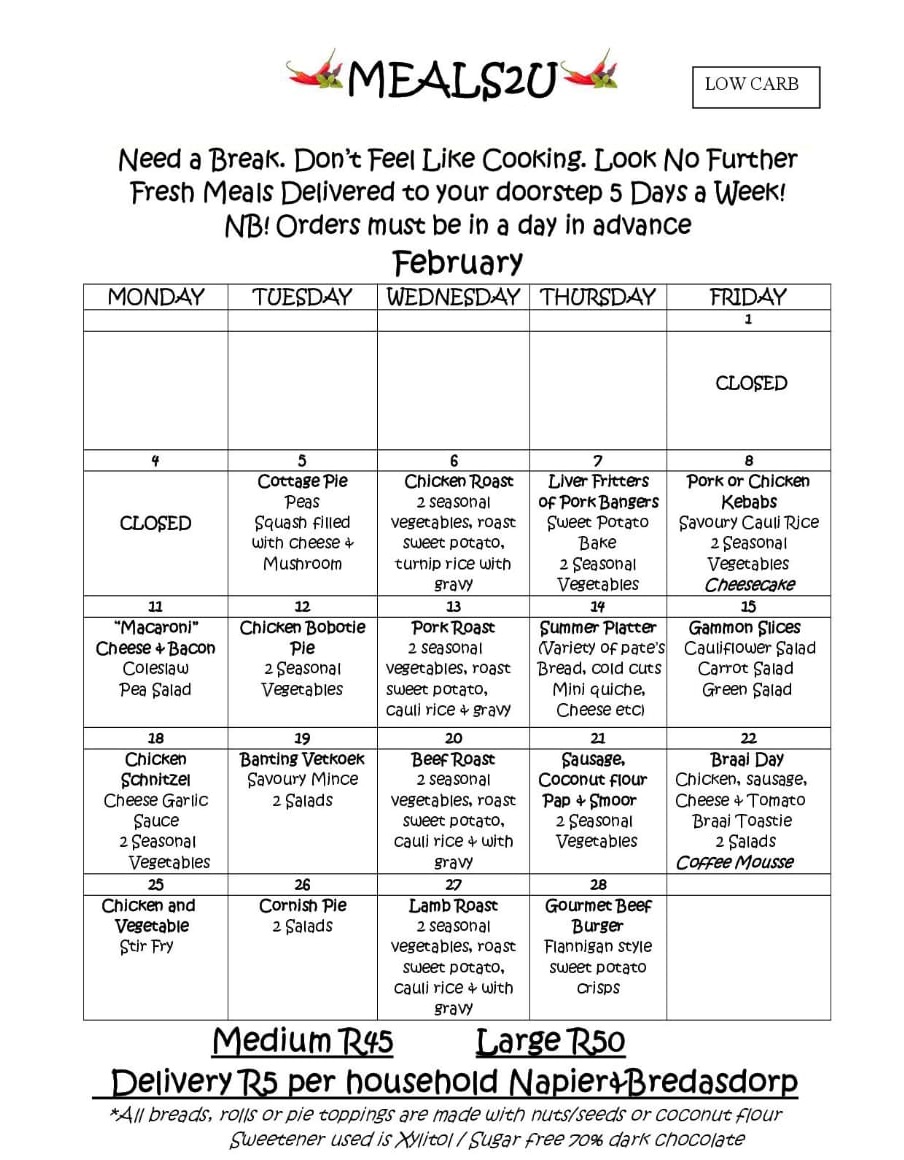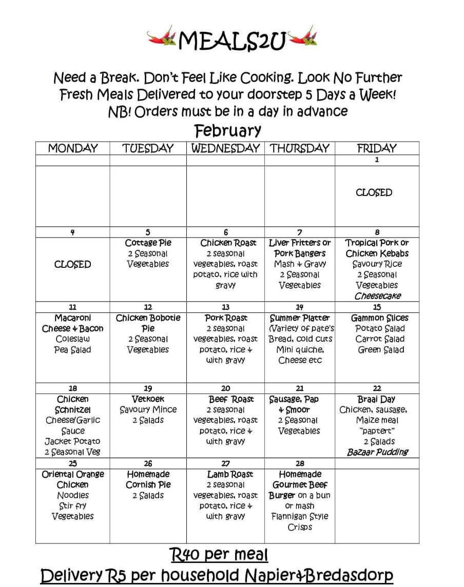 Meals2U charge a R5 delivery fee per household (yes you read correctly, only R5) in Napier and Bredasdorp.