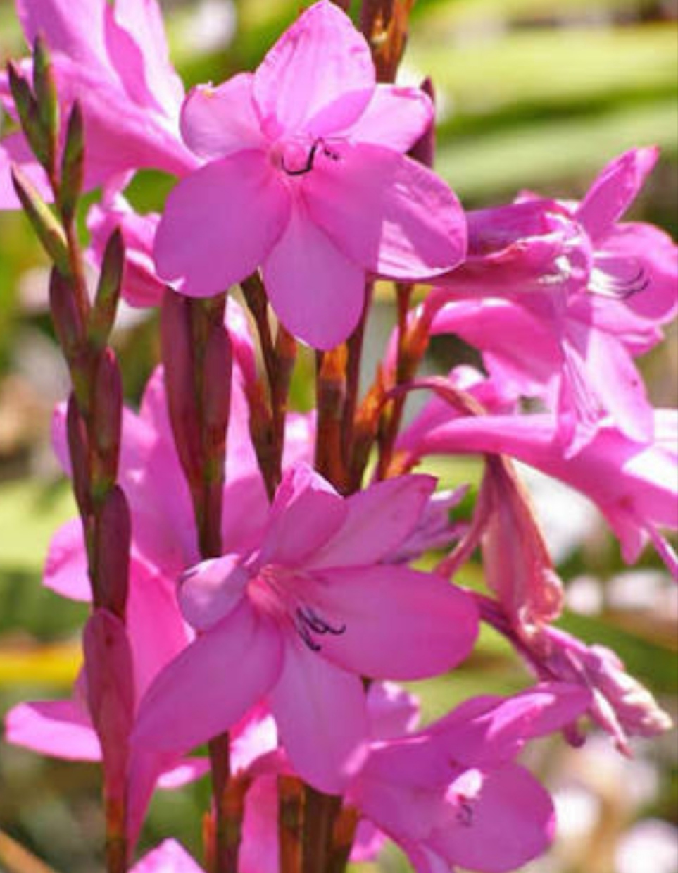 The flowering stem usually bears two or more small bracts in the upper part, is usually branched and reaches up to 2 m in height. The flower is a spike, the main axis bearing up to 20 flowers and the branching (lateral) spikes up to 10 flowers. The flowers are large and showy, pale to deep pink to light purple, and faintly fragrant. The tepals have a darker midline, and a white streak at the base and very occasionally a plant is found where the whole tepal is white.