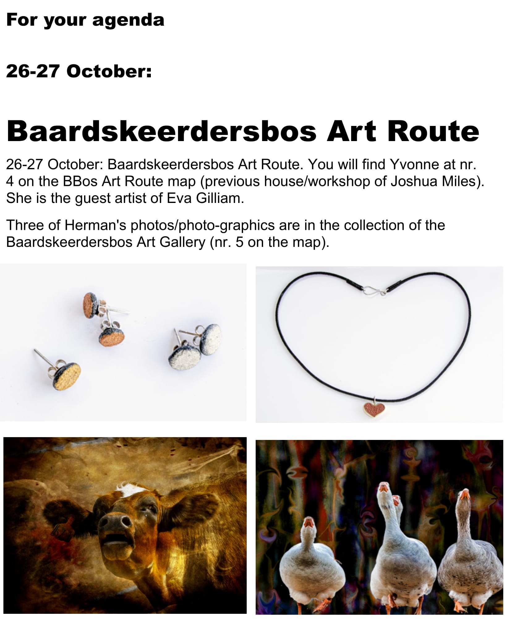 You will find Yvonne de Wit Jewellery Design at nr.4 on the BBos Art Route map (previous house/workshop of Joshua Miles). She is the guest artist of Eva Gilliam.
