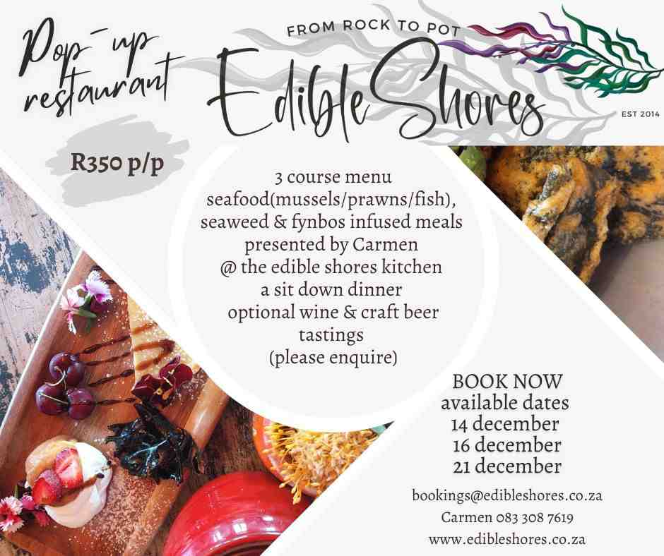 We off 5 to 6 hour experiences learning how to forage seaweed, fynbos and mushrooms from the earth sustainably. We take you out into the wild and show you all the different seaweed and mollusks that we can find. You'll learn how to harvest, clean and prepare the harvest and enjoy a 6 course meal. Many of the dishes would have already been prepared by us so that you can sit, relax, have a drink and enjoy the rest of your experience without too much hard work!