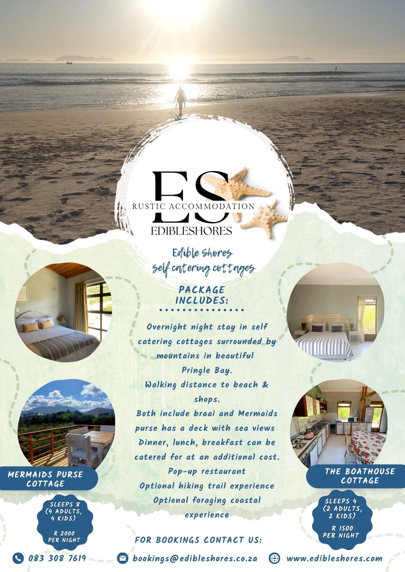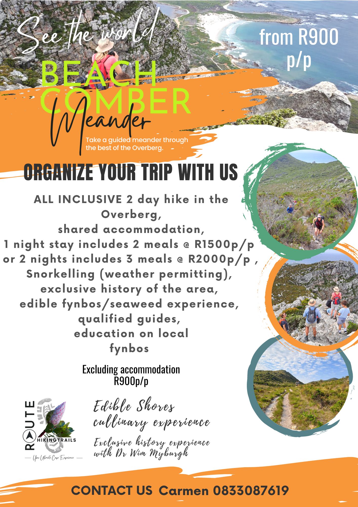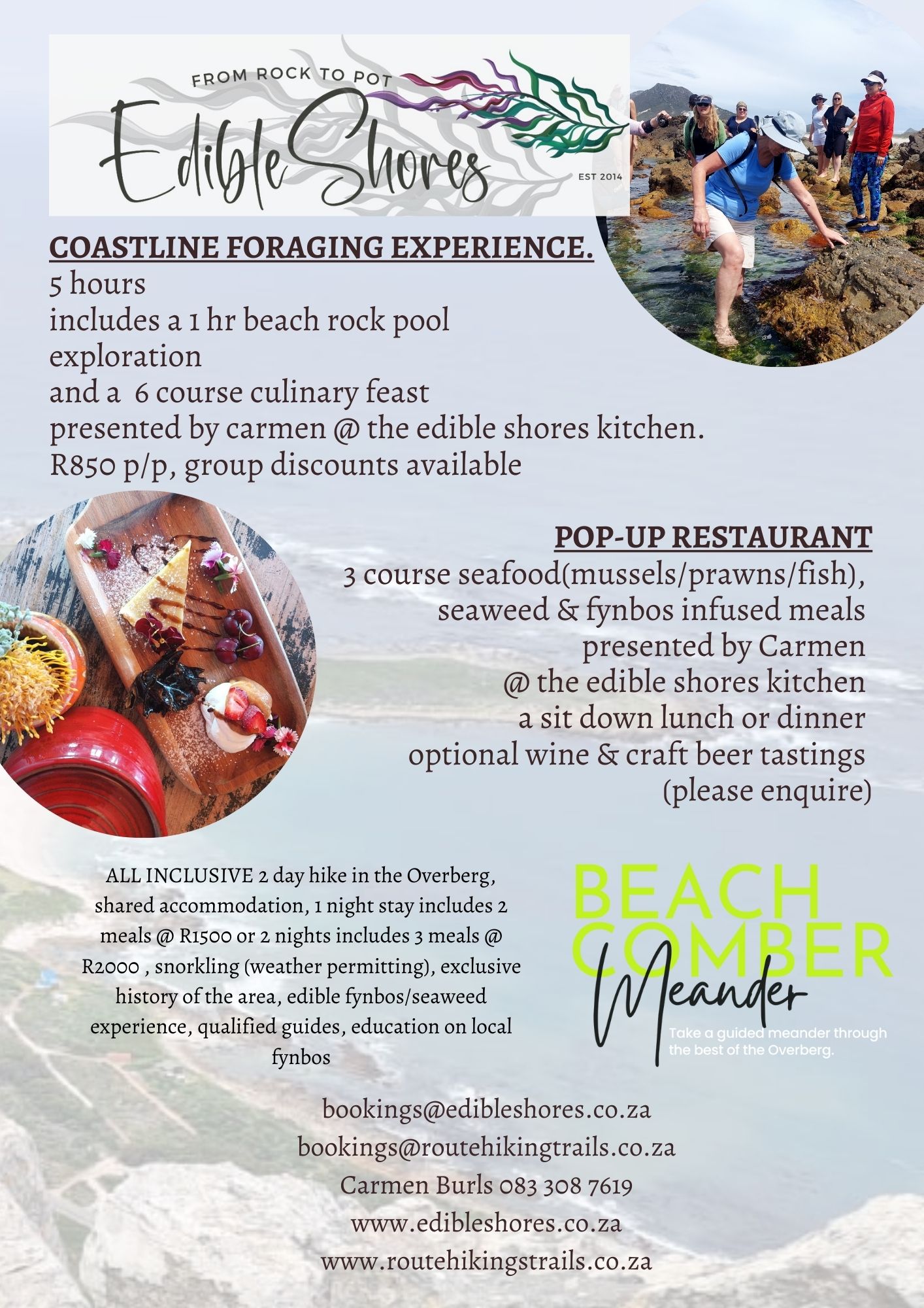 We also offer all-inclusive trips to those that are interested in a weekend getaway including guided hiking trails, 2 days in the Overberg, exclusive history of the area, snorkelling (weather permitting), breathing yoga workshops, meals and the option of accommodation as well as to join a foraging experience and/or pop up restaurant events.