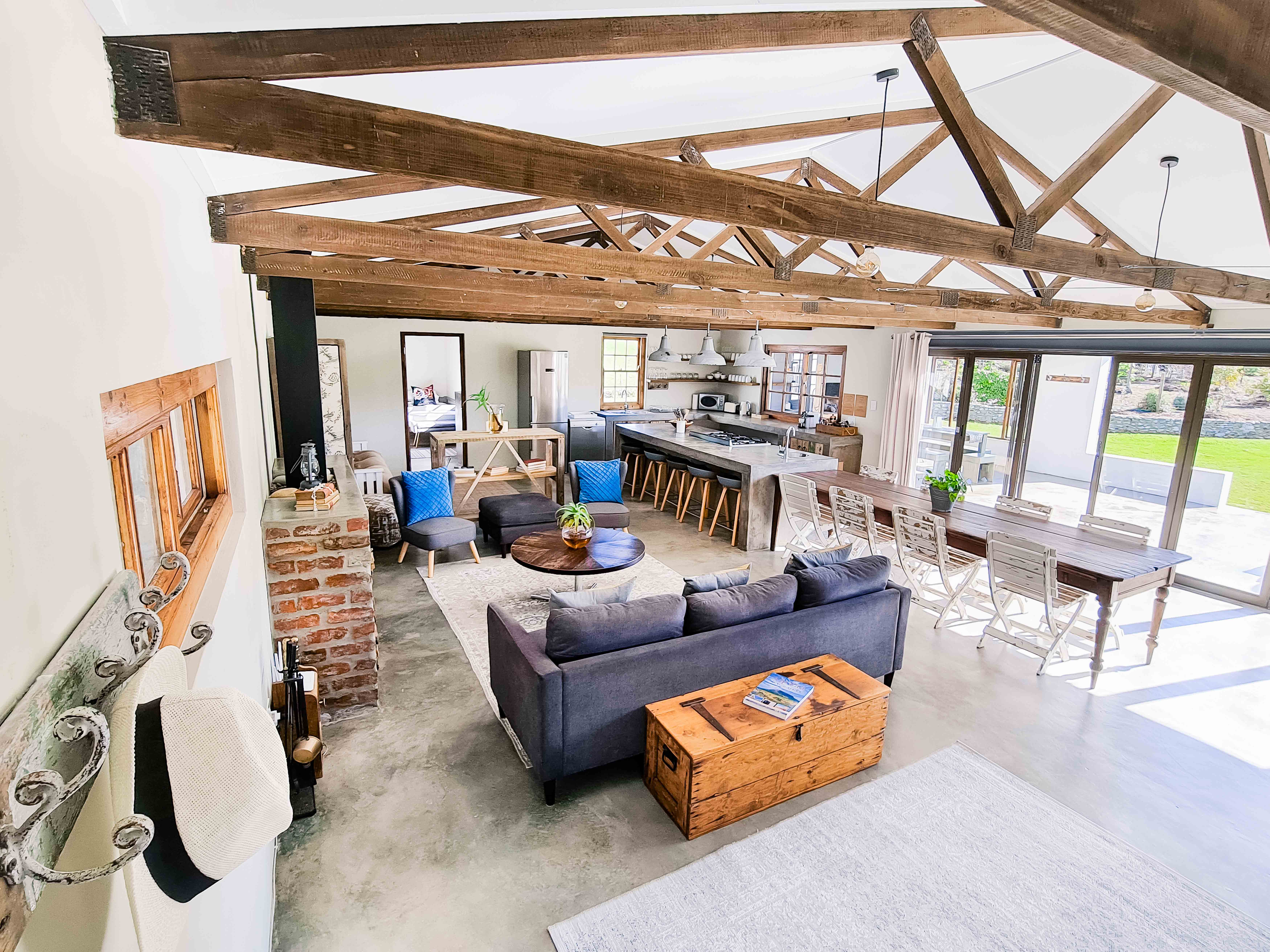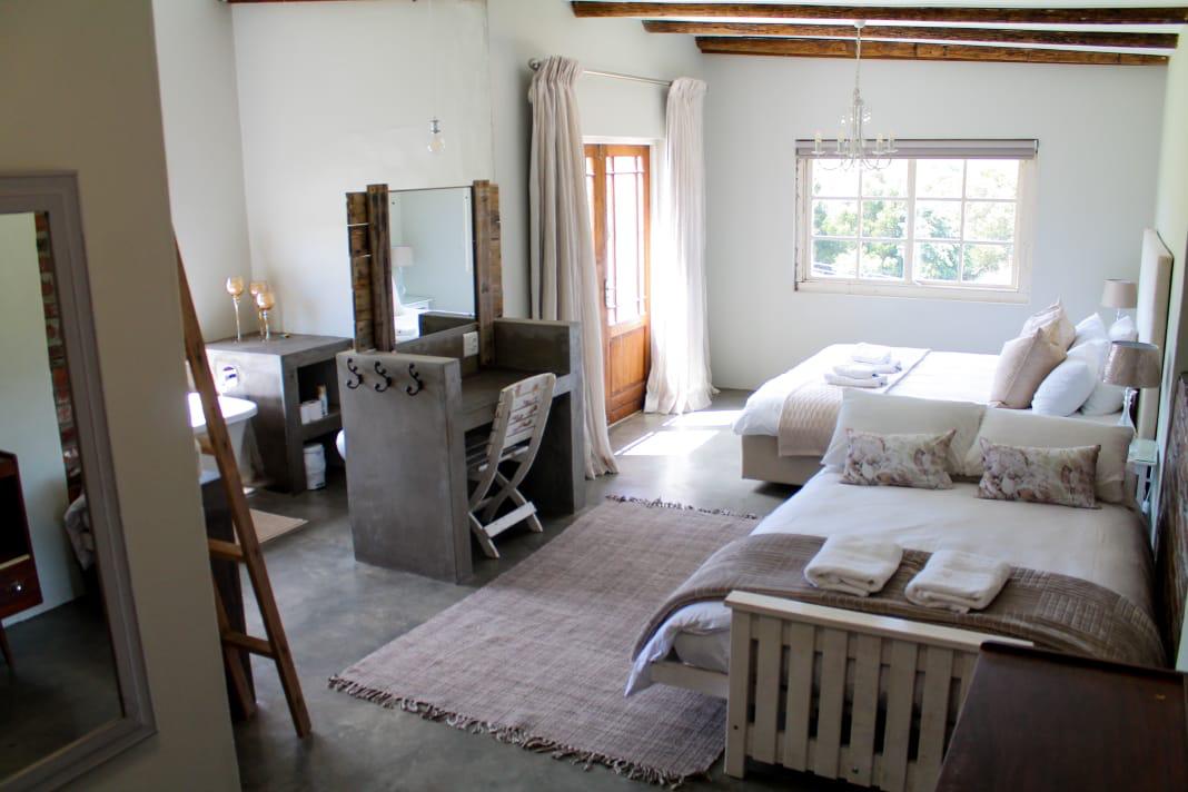 Die Melkstal, at Beloftebos Farm Cottages, is the farm’s original diary, The building was refurbished to create a two-bedroom cottage with views of the surrounding fynbos and the swimming and fishing dam. The cottage has a modern rustic farmhouse feel and its semi-enclosed veranda has a braai area and a wood-fired hot tub. There is an open-plan living area with a fully equipped kitchen that has a dishwasher, a long friendship dining table and a comfortable lounge with a fireplace and a double sleeper couch.