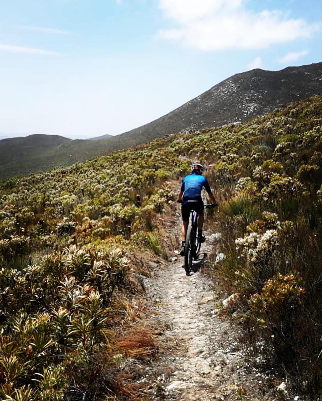 We will start the gradual climb up to the new single track named “Slipstream”, after Elsabe de Villiers, which runs along a beautiful section of undiscovered territory on the Stanford Valley Farm, and took a decent amount of time to build because of rocky sections and a few bridges. It is awesome and special with a few switchbacks joining up to the old jeep track again. If you are scared of heights - just keep pedalling and focus 10 meters ahead #adrenalinrush. We even got Reinder Nauta impressed by this.