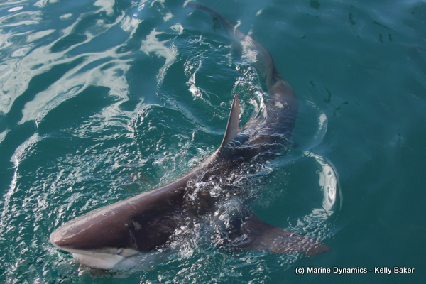 The second trip of the day launched on to a beautiful bay with the sun shinning, a slight wind to keep things fresh and a sneaky larger bit of swell here and there. Once on anchor we only had a few moments to wait till our first shark sighting as a Bronze whaler approached. Things were a little slow in the beginning as our winds shifted direction but we just had to wait for things to settle and the activity started to pick up and boy did it pick up, as our divers were continuously ducking under the water to see the sharks that just kept coming. We had the adult Bronze whalers around and a number of smaller individuals including a very tiny, inquisitive individual that made for some amazing views above and below water. Towards the end of our time on anchor the Short-tail stingrays came to the surface, with two individuals showing off the graceful movements that we associate with these magestic creatures. A fantastic afternoon spent out on sea for our guests and the crew of Slashfin.