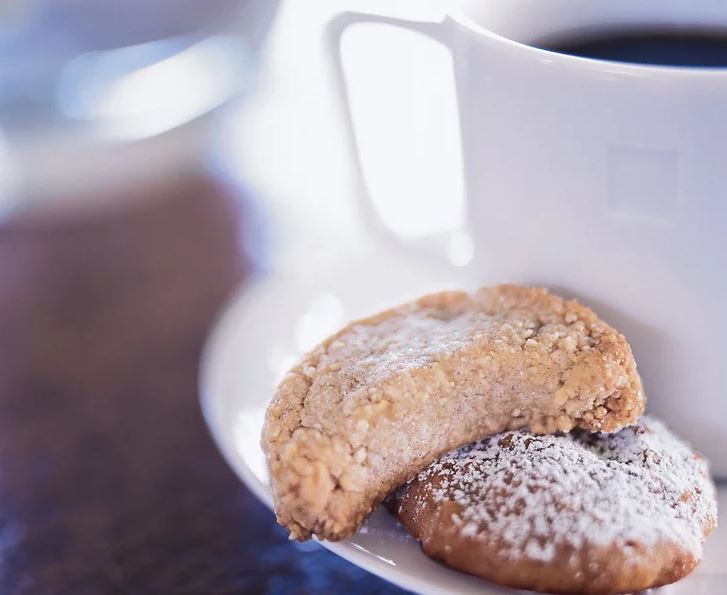 Form 1 tablespoon of dough into a bean or crescent shape and place it on the prepared baking sheet. Alternatively, form the dough into a ball, flatten it slightly and press down the center with your thumb. Repeat until the sheet is filled, spacing the cookies about 1/2 inch apart. Bake for 20 minutes, or until the cookies are pale brown and firm. Transfer the cookies to a wire rack to cool and repeat with the remaining dough.