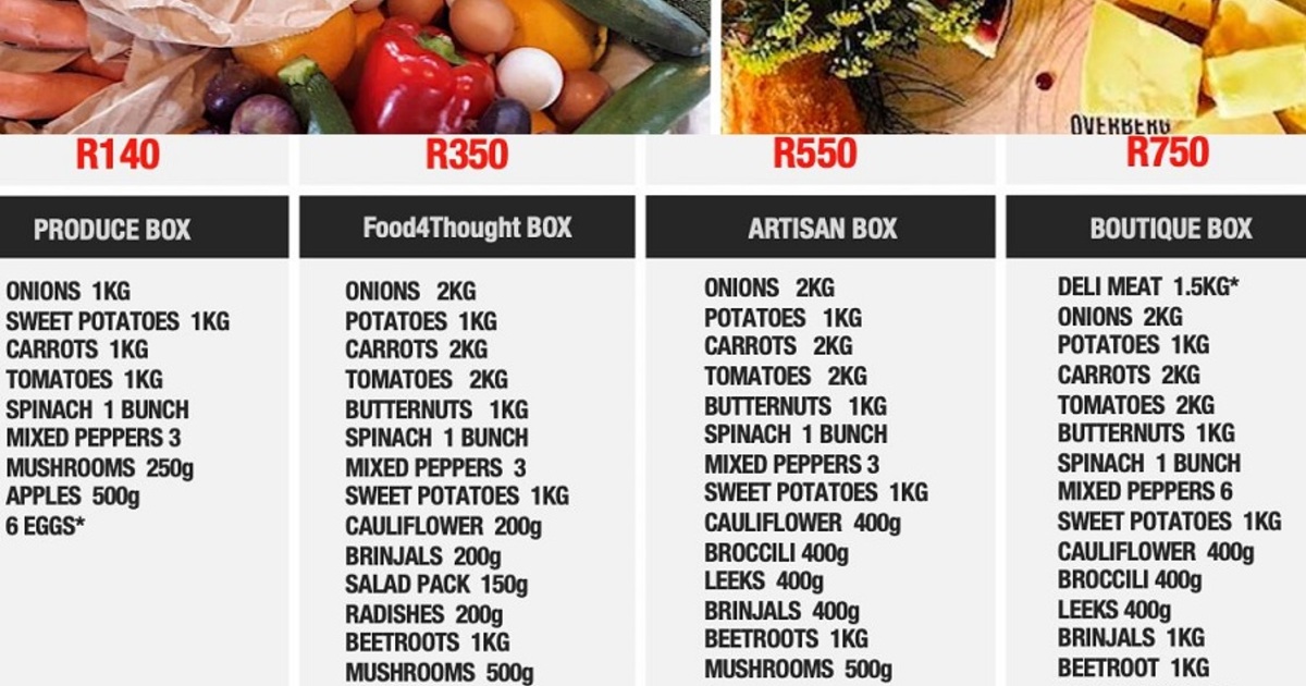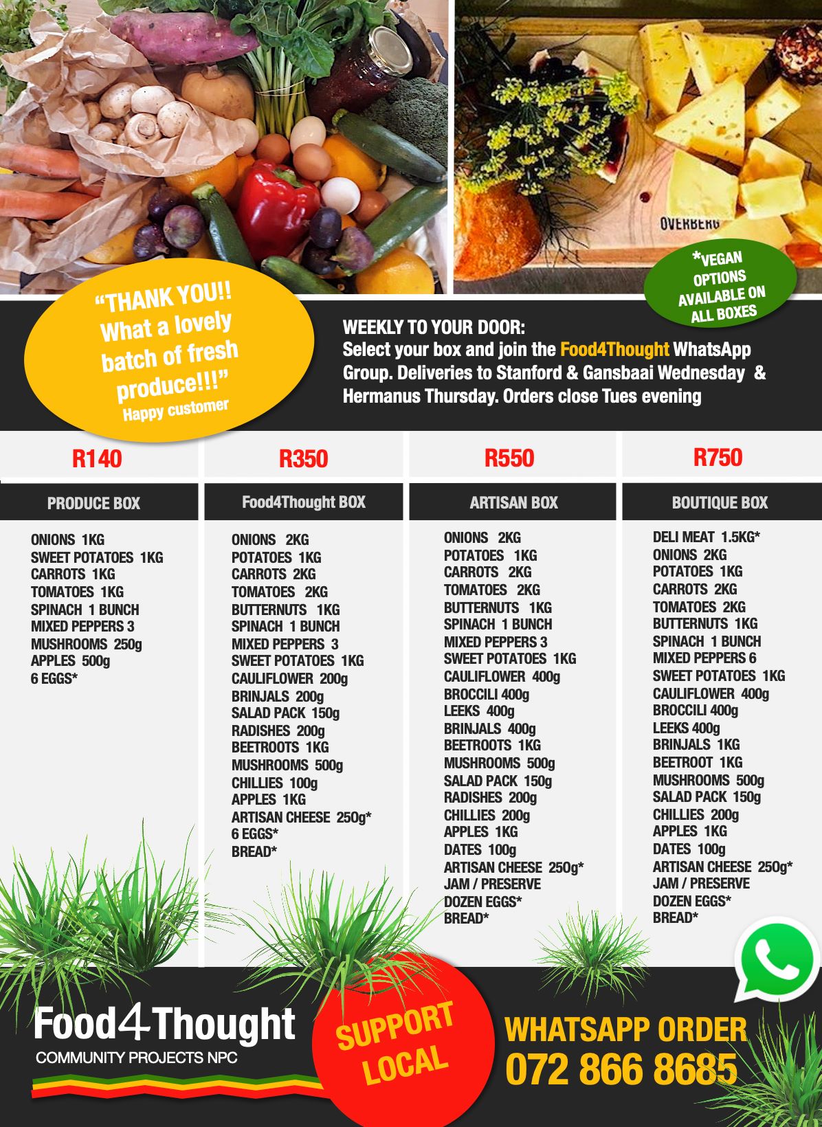 Select your box and join the Food4Thought WhatsApp Group (072 866 8685). Deliveries to Stanford & Gansbaai on Wednesdays and Hermanus on Thursdays.