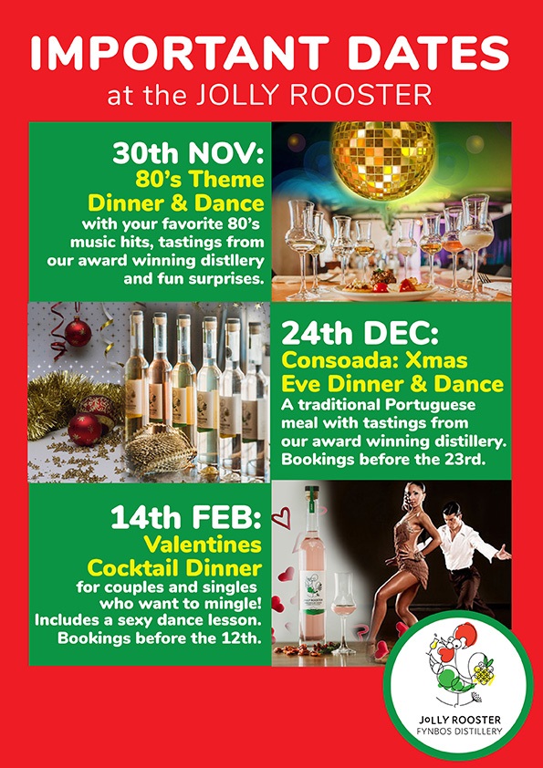 Jolly Rooster @ Fynbos Distillery distillery in Stanford offers food and spirit pairing, a Portuguese-themed menu, and the sale of award-winning distilled products. From the earth to the bottle, Jolly Rooster @ Fynbos Distillery in Stanford strives to make the best spirits money can buy. Award-winni...