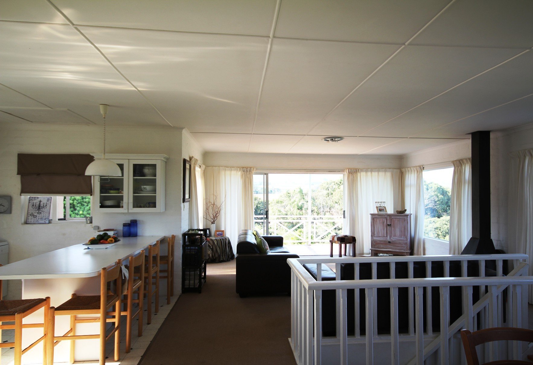 Upstairs: Large open plan living with french doors onto patio looking out to mountains and over the river.