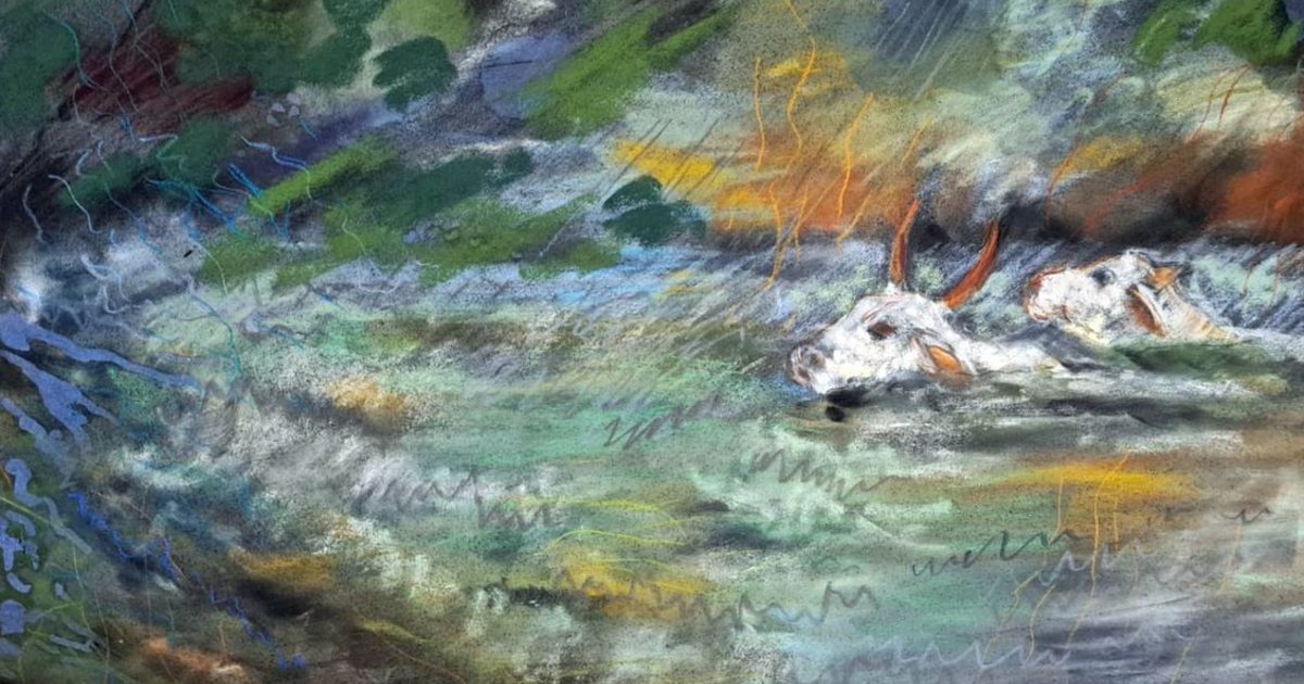 In these two enchanting depictions of the Klein River in flood, she uses pastel to create a tangible sense of the liquidity of the rushing water, its sound and a strong sense of the all-encompassing water.