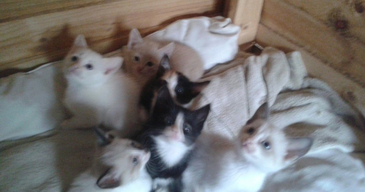 We are the two white kittens among this litter and we would like to tell you a story with a happy ending.