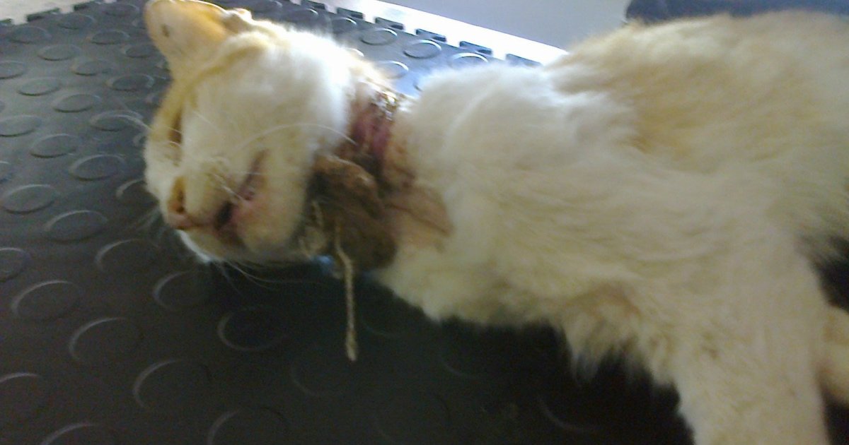 Awful, but this is happening. PLEASE DO NOT put anything around a Cat's neck that can not stretch - for that matter anything around ANY animal's neck that is not a collar!!!!
