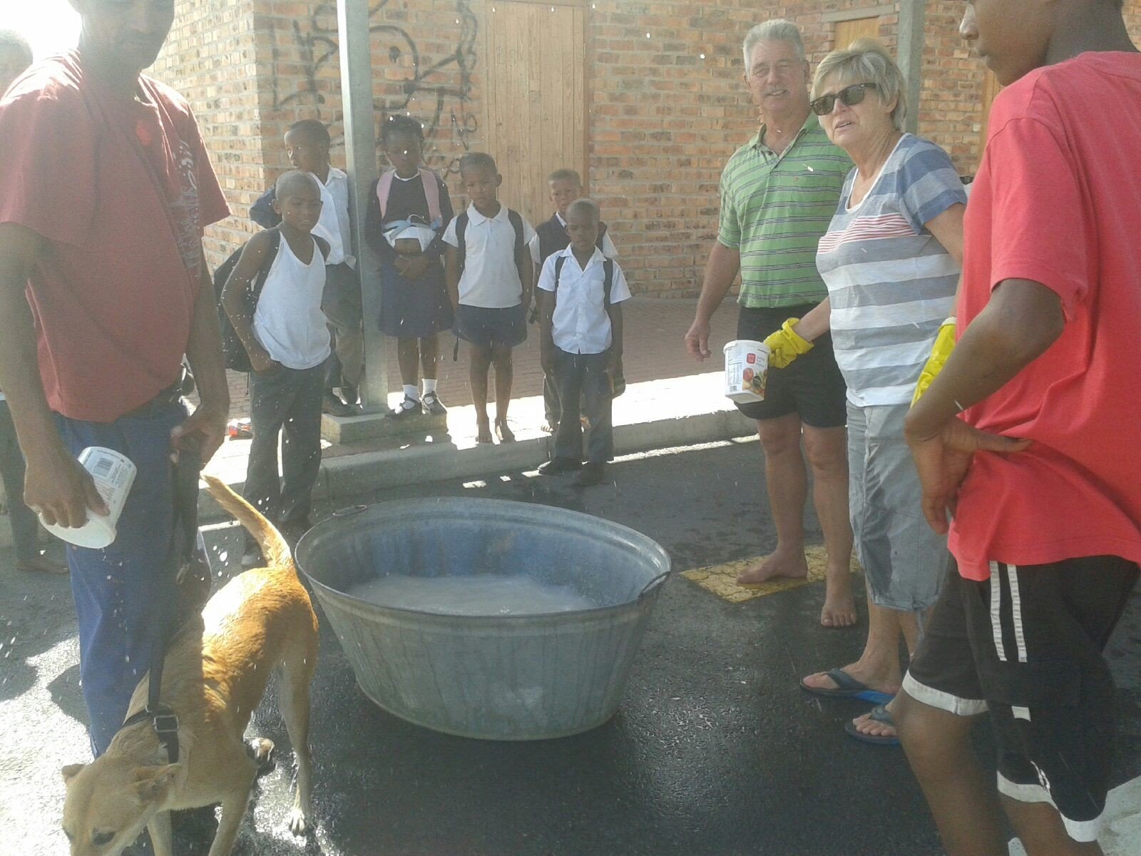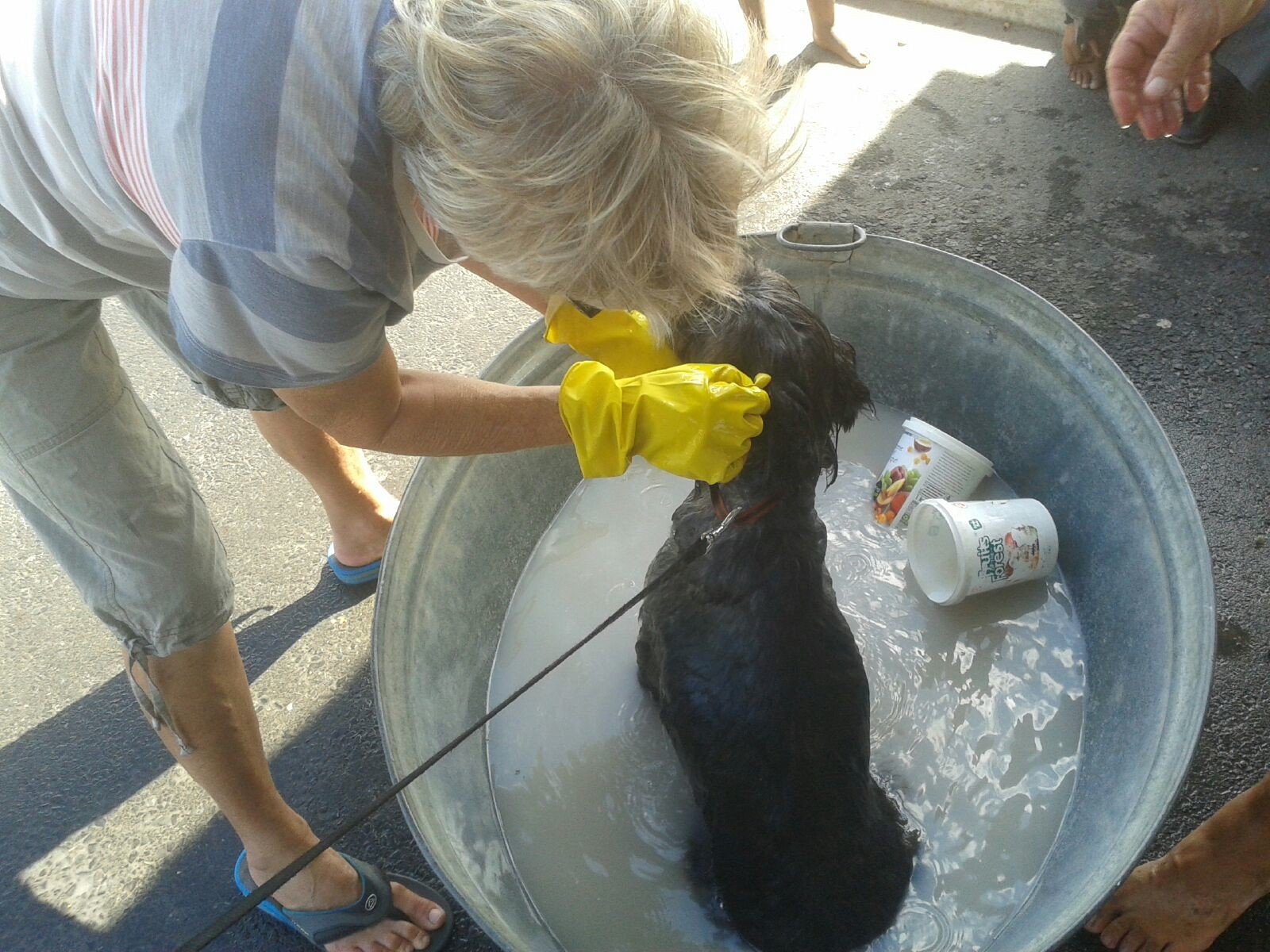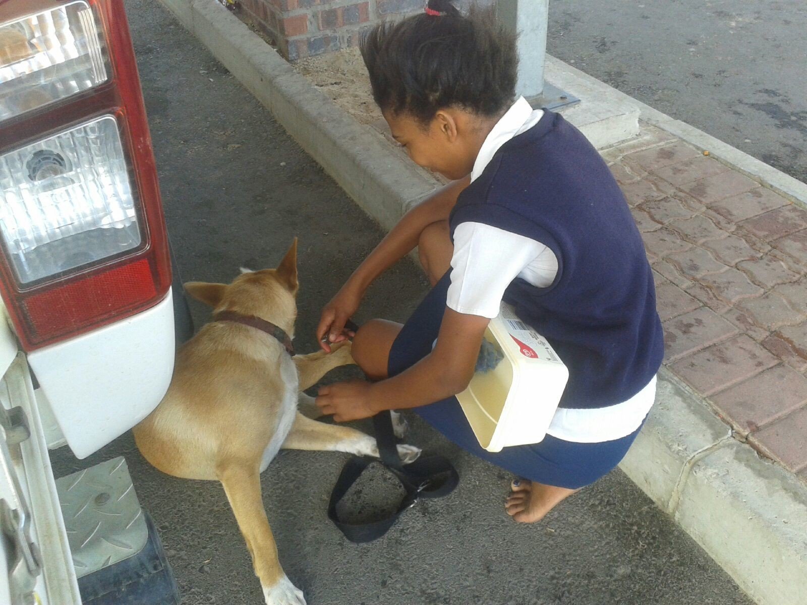 The field workers of Stanford Animal Welfare at it again with the dip dance. Giving out toys and containers for food and water..