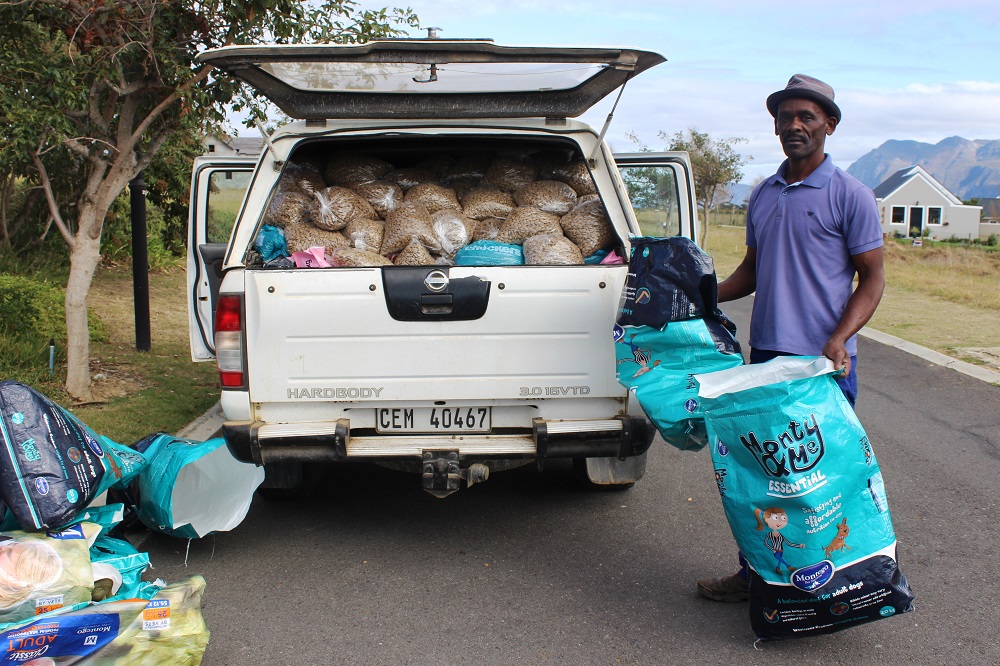 Thanks to the generosity of private donors right from the start, pet food donations poured in. Food was collected and delivered to Die Kop and to the designated areas in Stanford South. Dog food was packaged in 2kg bags and cat food in 1kg bags each.