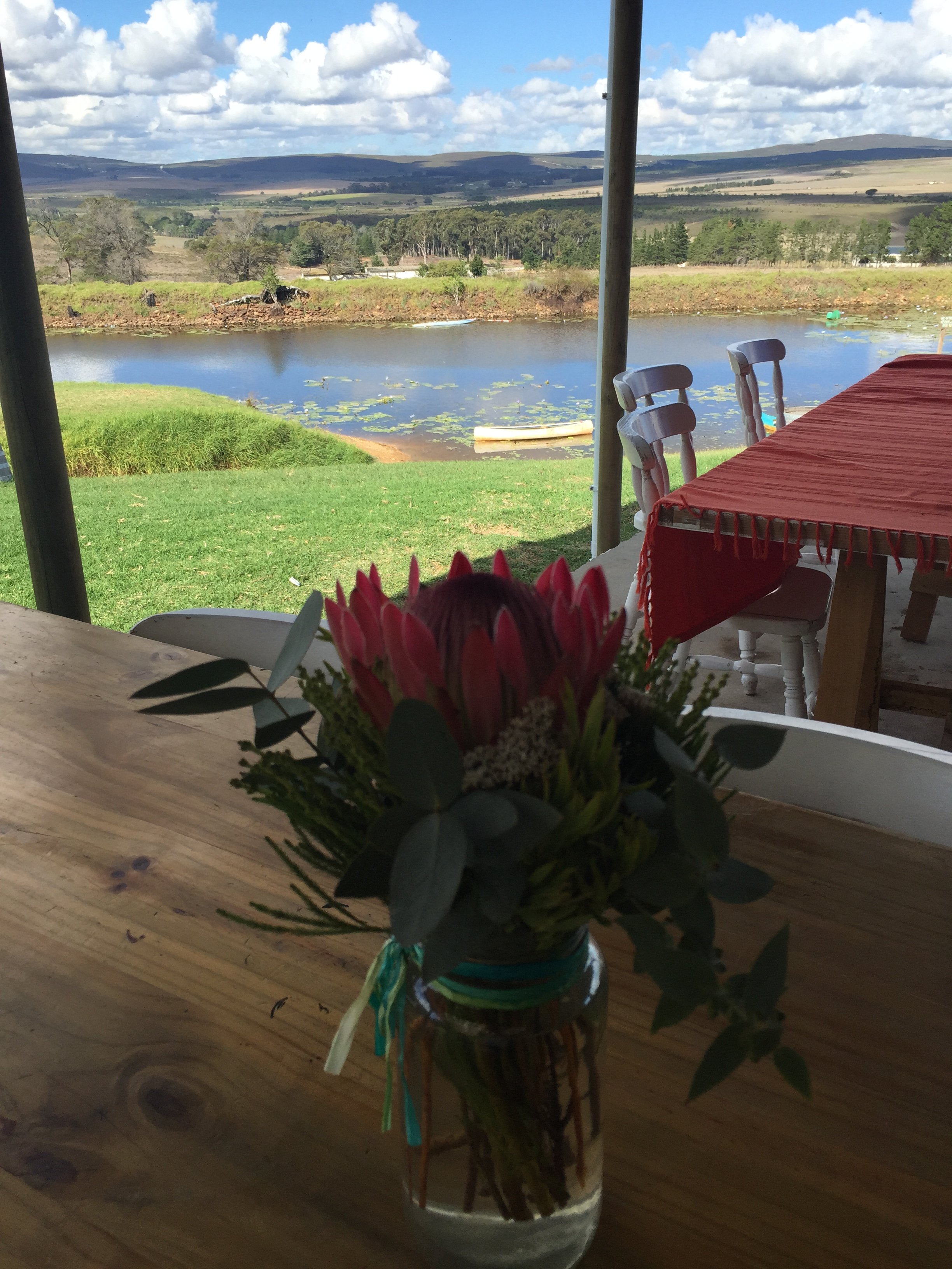 A short drive from the village of Stanford along a quiet dusty road, past groves of olive trees and protea bushes ends at the delightful Tasting Room at Stanford Hills winery. An open, spacious restaurant with forever views over a tranquil pond complete with ducks, a rowing boat and boisterous boys. A perfect place to enjoy a casual lunch, a chat and a glass of chilled wine while farm dogs and a lamb stop at your table in greeting.