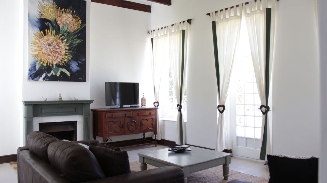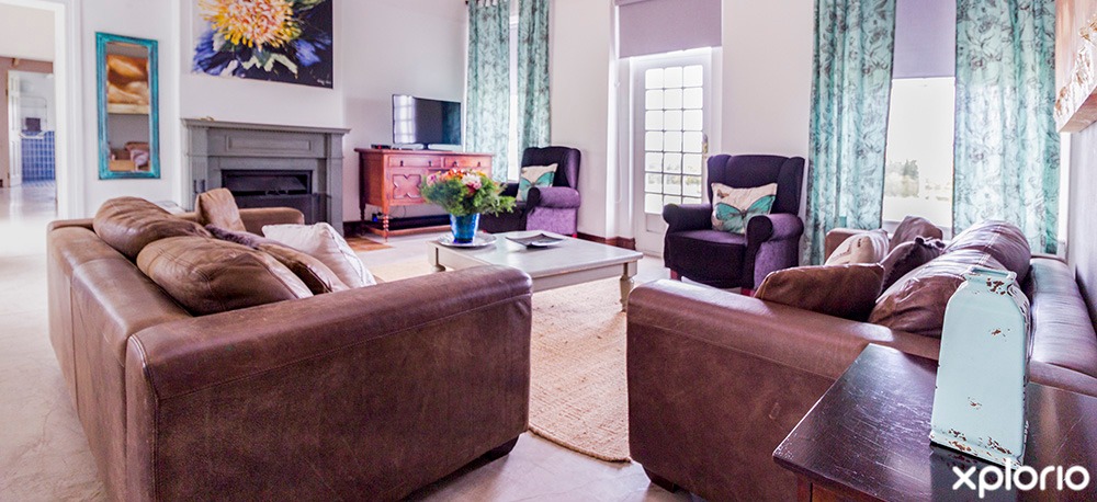 There are French doors that lead to a patio that divides the two main living areas of the main house. The large lounge is comfortably furnished and has an authentic manor house feel with its oversized leather couches, a library of books and an indoor fireplace.