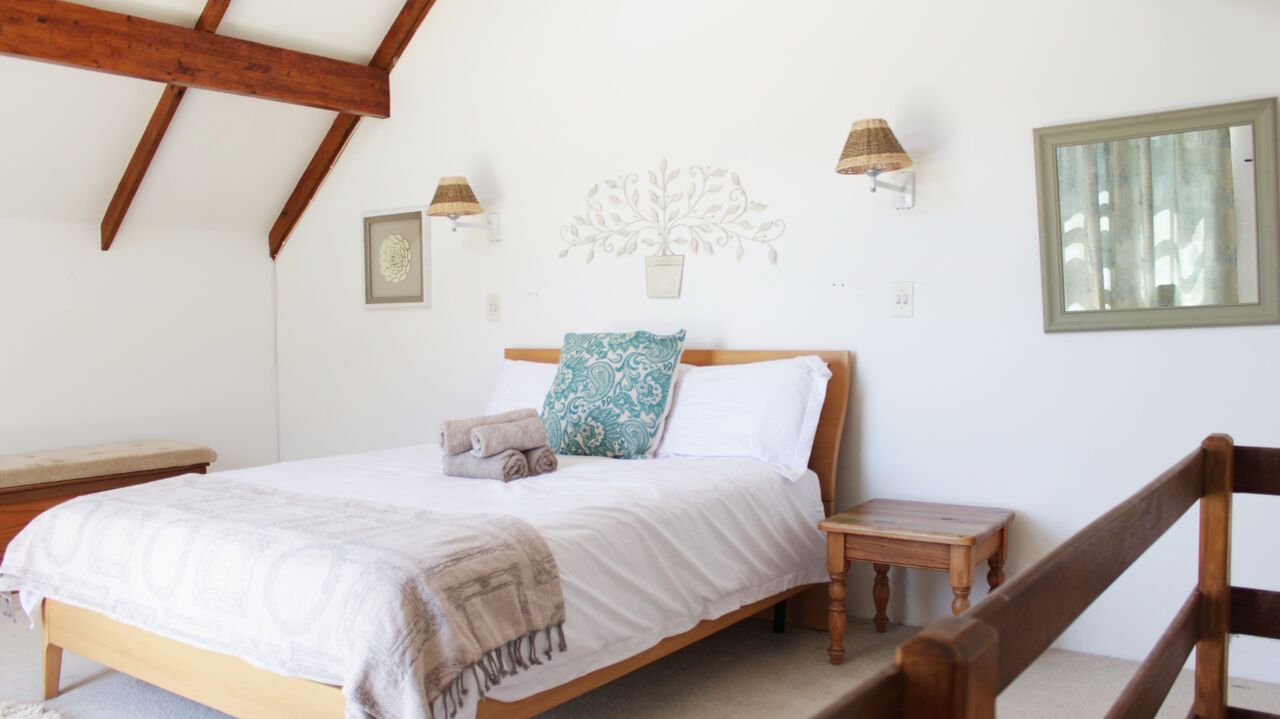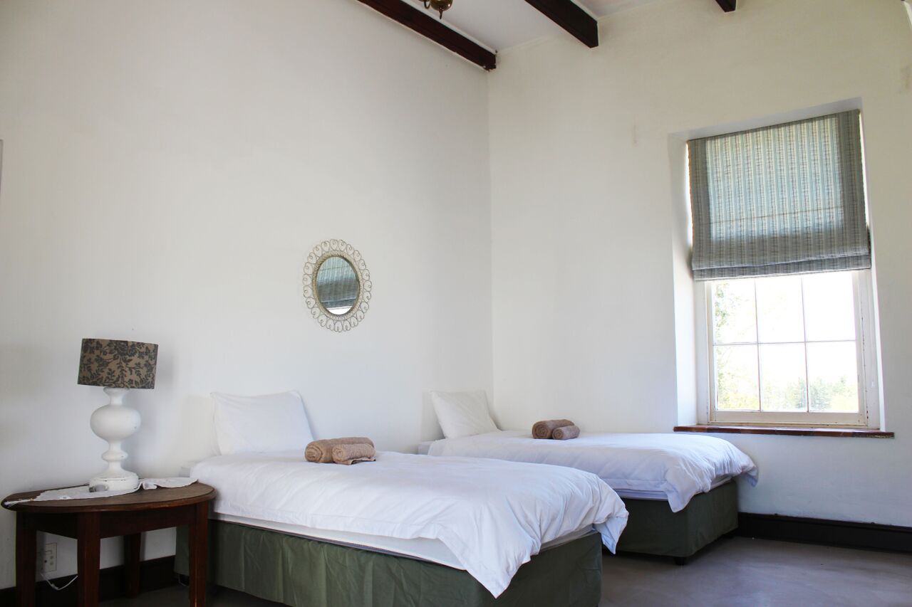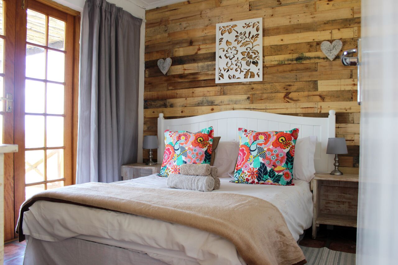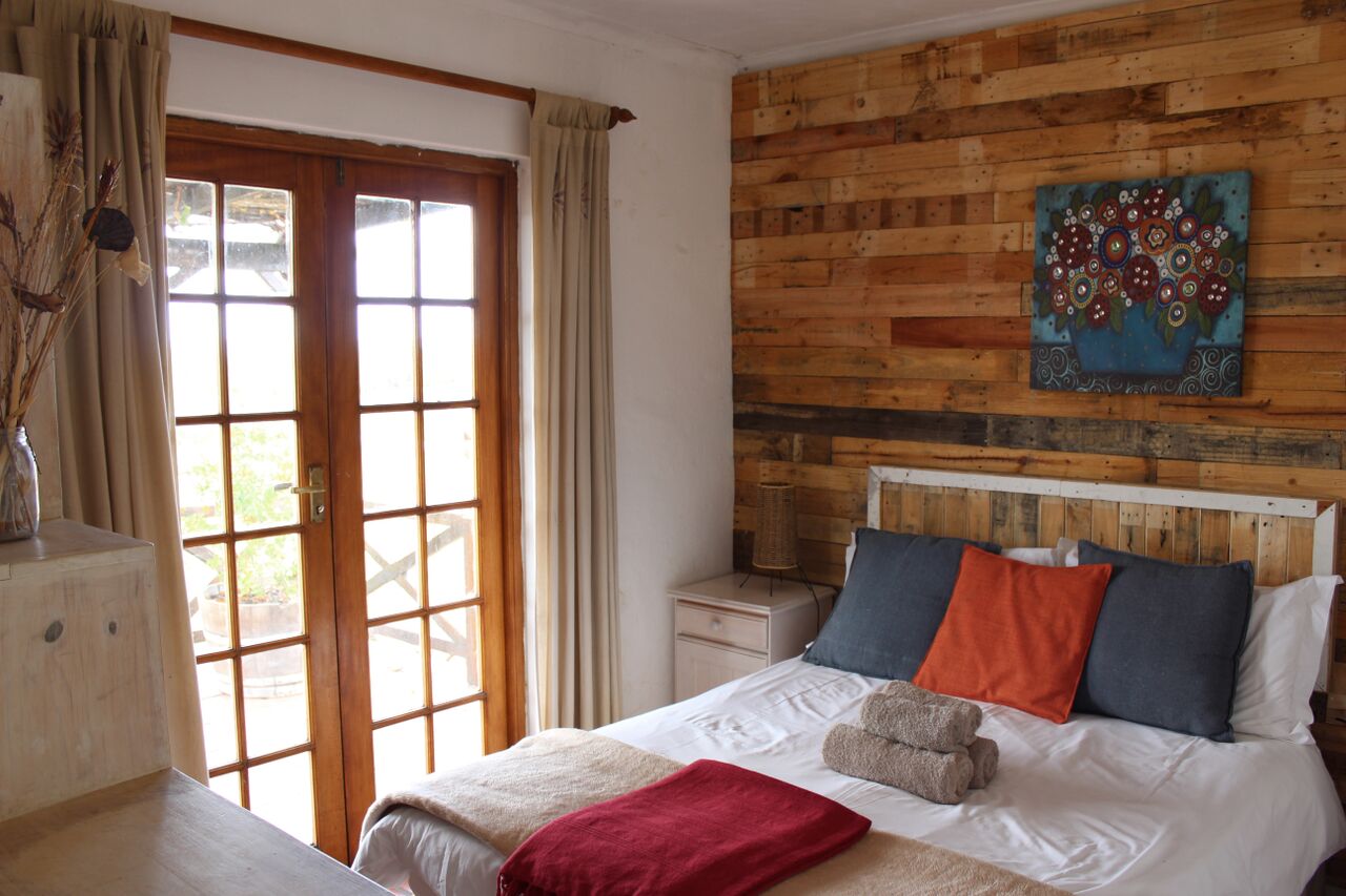 The upstairs bedroom in the east wing has a loft-like feel and the small balcony offers guests a magnificent view over the farm dam and the Stanford Valley that surrounds it. This room has a Queen-size bed.
