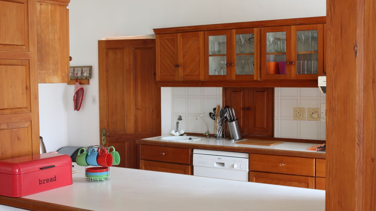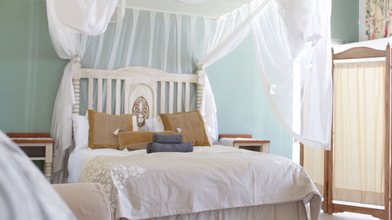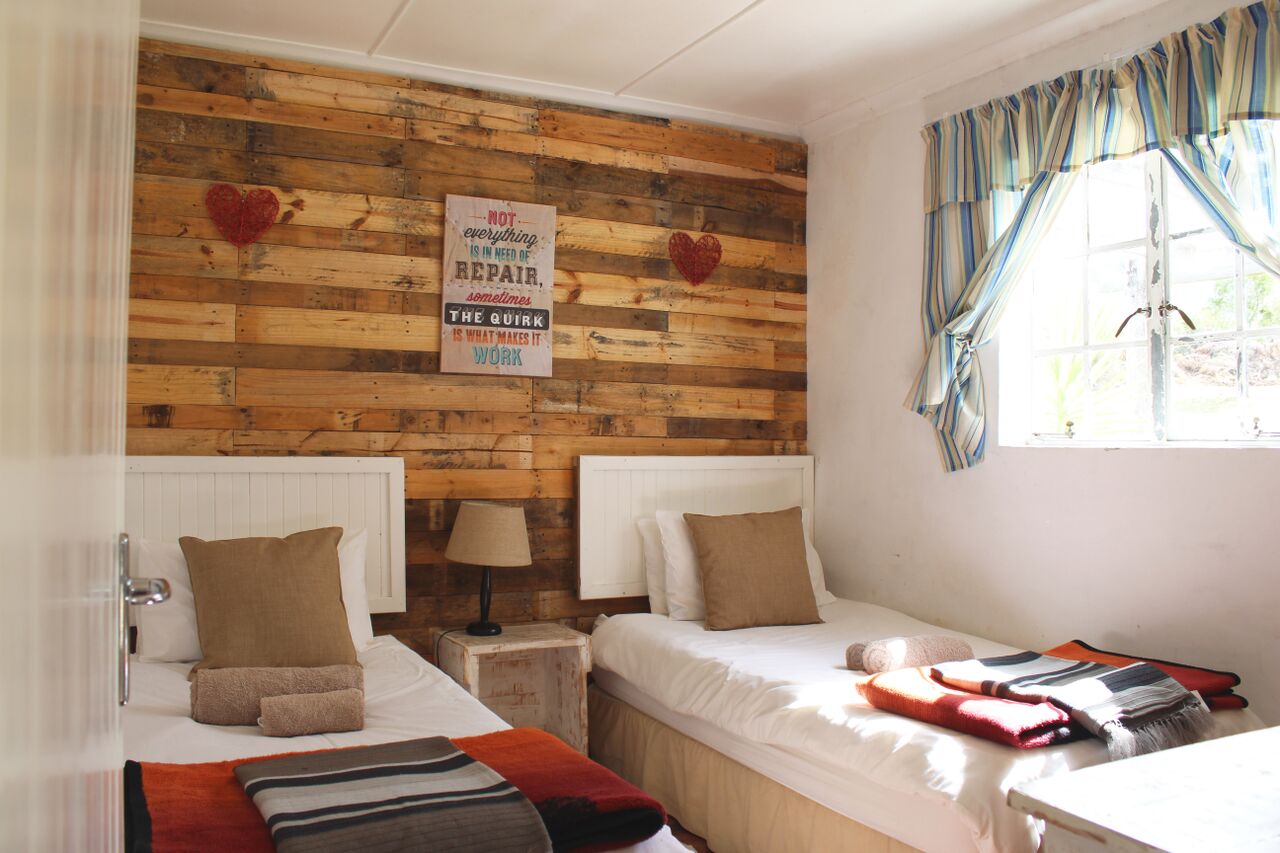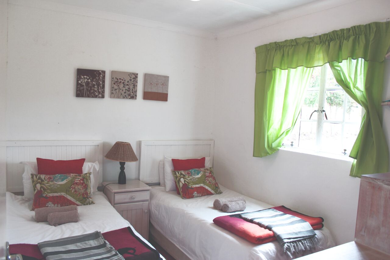 The upstairs bedroom in the east wing has a loft-like feel and the small balcony offers guests a magnificent view over the farm dam and the Stanford Valley that surrounds it. This room has a Queen-size bed.