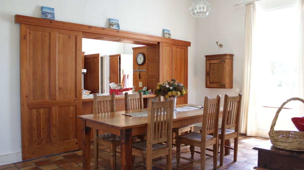 The open-plan living area has French doors that open out onto a pétanque court. There is a fully-equipped kitchenette and a cosy lounge with an indoor fireplace.
