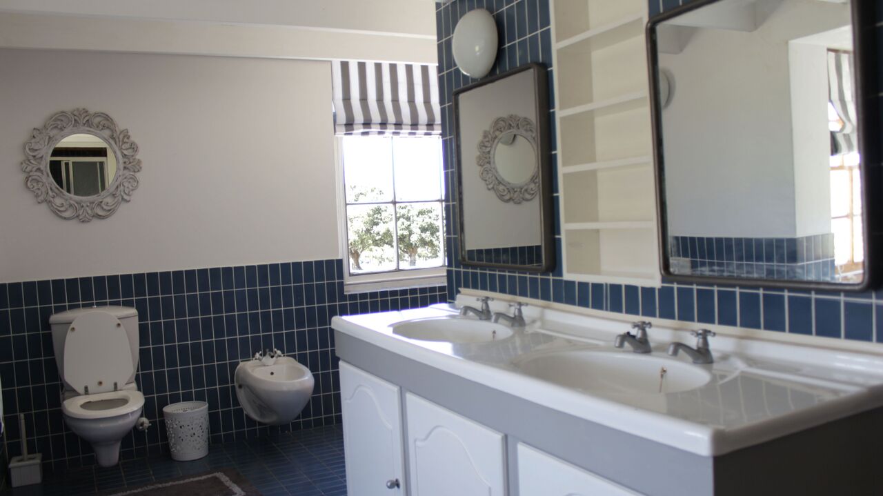 These two bedrooms share a spacious guest bathroom that has a bath, shower, double basin, bidet and toilet.