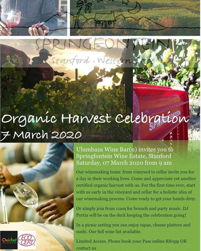 Our First Organic Harvest Celebration on 7 March 2020 at Springfontein Wine Estate is a one day event, created to celebrate our vines, unique terroir and the hardworking women and men creating this unique product. During this day lovers of this unique place on earth and its wine will flock down the dirt road to spend a working day exploring our natural approach to wine growing and wine making. From the vineyard to our boutique cellar, followed by a brunch in the garden from 11am and our signature Pinotage & Chenin blanc. Savor unforgettable morsels sourced locally and made by our amazing Ulumbaza Wine Barn team. A sushi bar for the day too.