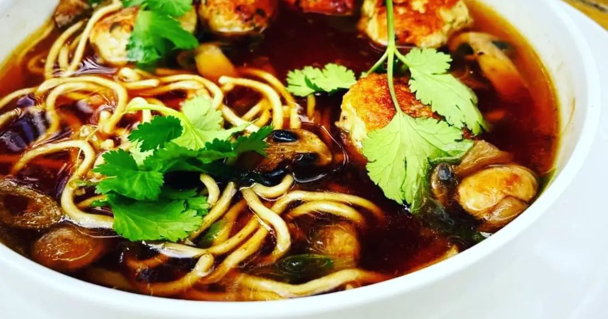 One of our delicious new menu items, already proving very popular... spring onion and coriander chicken meatballs in mushroom, ginger and soya broth.