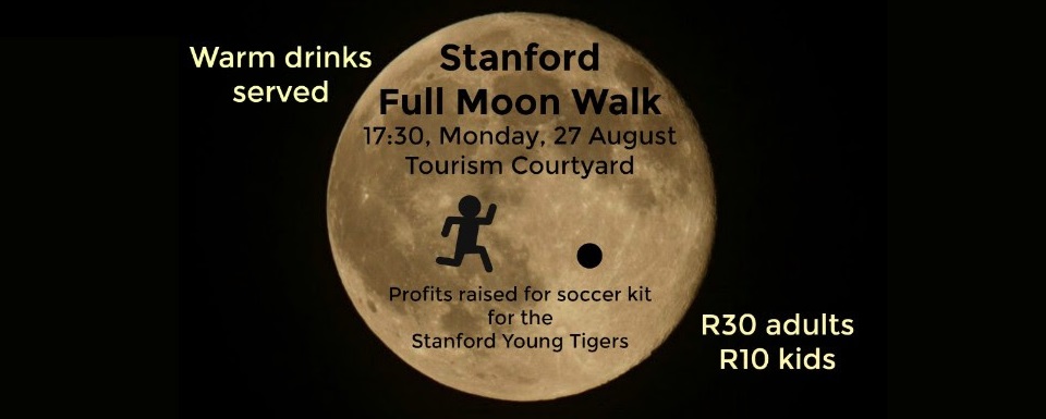 This month's Full Moon Walk raises funds for the Young Tigers Soccer Kit. Join us for a walk around the village, wrap up warmly, and stay for a complimentary warm drink. R30 adults, R10 kids, dogs on leash welcome. Weather dependent.