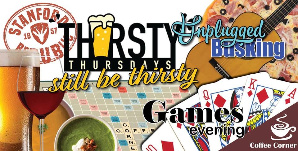 Don't go thirsty on Thursdays! Stanford RePUBlic and Coffee Corner has buckets of fun lined up. Unplugged buskers and playing board games or just having a chin wag with the locals! Beer on tap, local wines, pizzas and soups available. Warm cozy fires to keep the brrrrrr away.