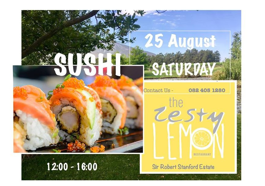 Sushi Saturday @ Zesty Lemon - 25 August - from 12:00 - 16:00. Come enjoy our famous Sushi...for the ones not eating Sushi we have Specials and our Standard Menu...Contact Us for bookings. Feel Free to bring your Friends, Family, Kids & Dogs.