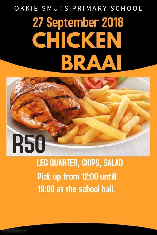Support Okkie Smuts with their chicken braai for only R50. Includes a leg quarter, chips and a salad.