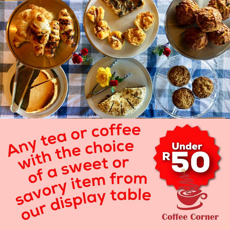 Coffee Corner is running an October daily special on any coffee/tea plus any piece of savoury or sweet confectionery from our display table for under R50!