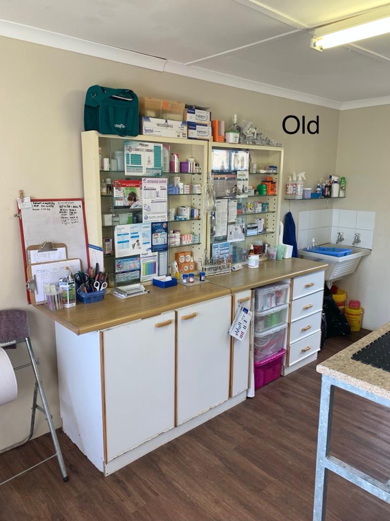 The cupboard installation was done this year at the Stanford Vet. Materials used for the cupboard installation included: White melamine and white formica postform tops with stainless steel bar handles and ballbearing runners. The top unit (glass door unit) was refurbished (sanded and sprayed with satin white). We also replaced the old wash trough with a drop in wash trough (plumbing done by us). The drawers were custom made to fit the client's specific needs.