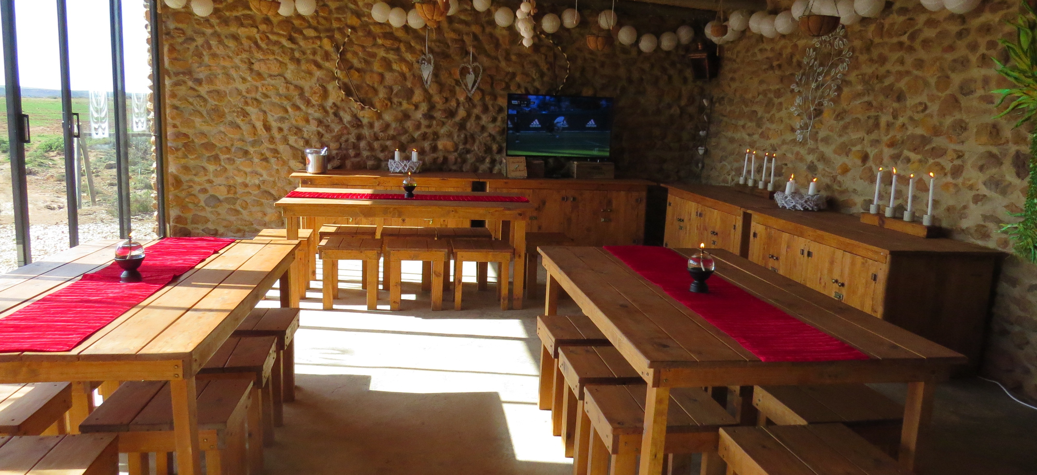 Aloe Canyons Lapa is ideal for smaller intimate functions. Awesome views of wildlife grazing around the venue. It can take up to 60 guests seated, 24 - 30 inside and 40 guests outside.