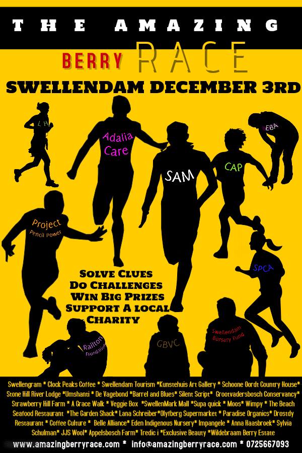 The much loved Amazing Berry Race will take place on Saturday 2 December. In aid of local charities, the race will continue its riotous dash through Swellendam with teams completing hilarious tasks and activities. Organisers have added a new flair with corporate teams being challenged to up the ante. Corporate entrants are required to pay R500 per team, while individual teams pay R100 per team. Put on your brightest colours and support your preferred charity or cause.