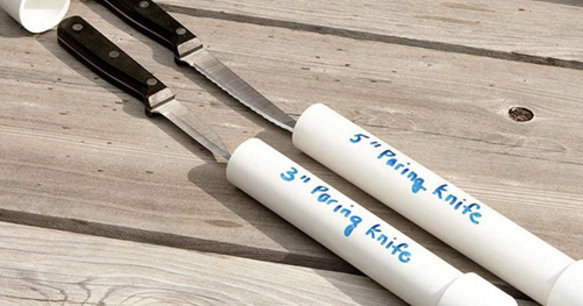 Carrying kitchen knives safely for picnics and camping trips is challenging. A trick for this is making knife containers out of 2 PVC pipes and caps.