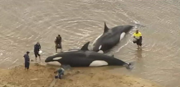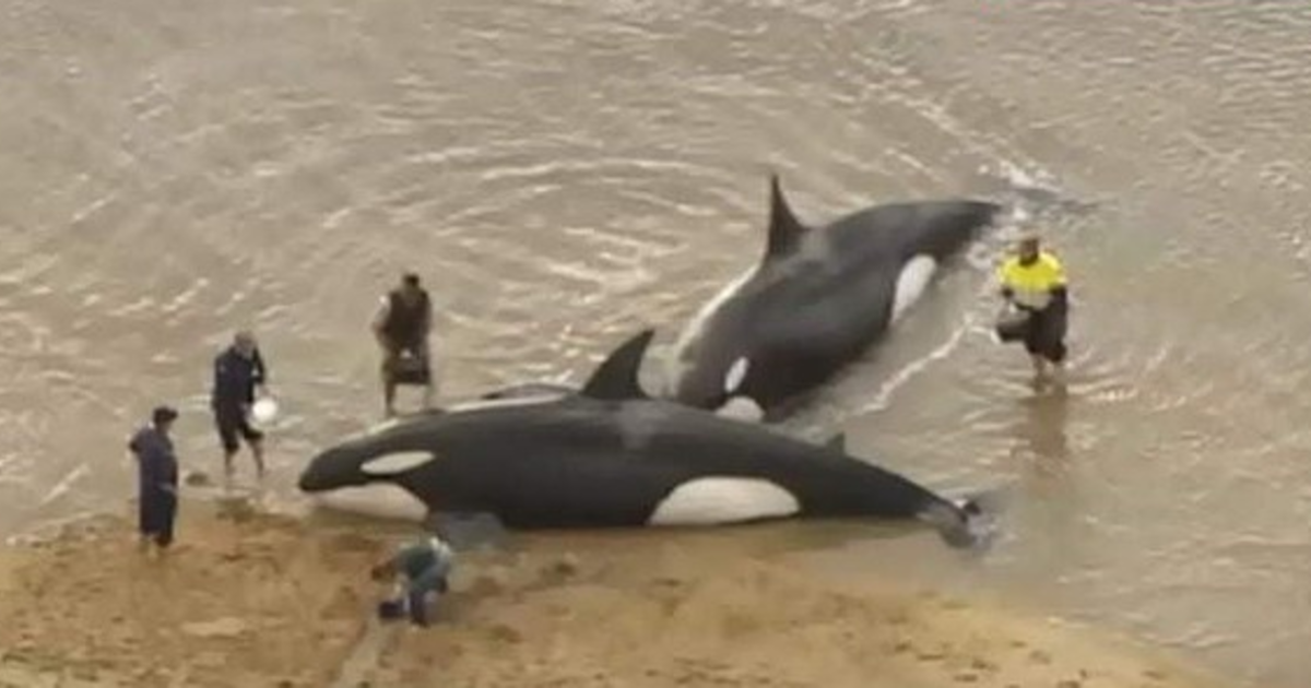The coast south of Queensland, Australia saw the unusual stranding of a group of Killer Whales yesterday. Australian rangers and officers rushed to the scene to help as a fishing boat kept a close eye on them from the water.