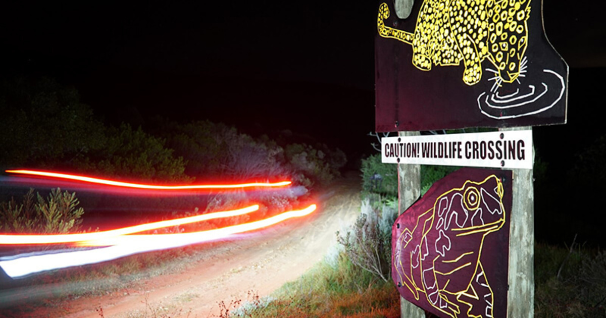 In an innovative move to alert motorists to slow down for toads, leopards and other animals, The Tale of Two Leopards’ Spotted on the Road campaign team worked with Cape Town-based artist Bryan Little to create reflective road signs. Based on where camera traps have confirmed toad mortality by vehicles and leopard sighting signs have been placed at five locations in the Overberg on tarred and dirt roads on both public and private land.